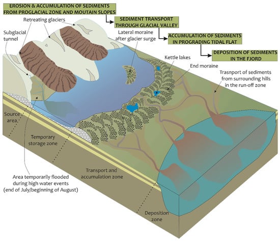 The volume of material transported from land to sea also depends upon the distance it will be entrained for. Generally, the longer the distance to the coast, the smaller the volume of material that will reach this point. Zajączkowski [] also demonstrated the difference in the source providing the material, as well as in the bed topography of the fjord, using Adventfjorden and Kongsfjorden, Svalbard as examples. Whereas the sediment transport over the shallow tidal flat of a delta was relatively short and resulted in reactivation of previously deposited material, the transport distances in a marine-terminating glacier-dominated fjord were substantially longer. Zajączkowski and Włodarska-Kowalczuk [] reported the highest concentration (826 mg L−1) of suspended sediments at the edge of the tidal flat and over the upper slope of the delta in Adventfjorden. Kim et al. [] reported possible progradation of a delta system in Dicksonfjorden which is very likely linked to high input of suspended sediments from the large glacier-fed basin. Lateral movements of sediment spits were reported in only a short period of time.