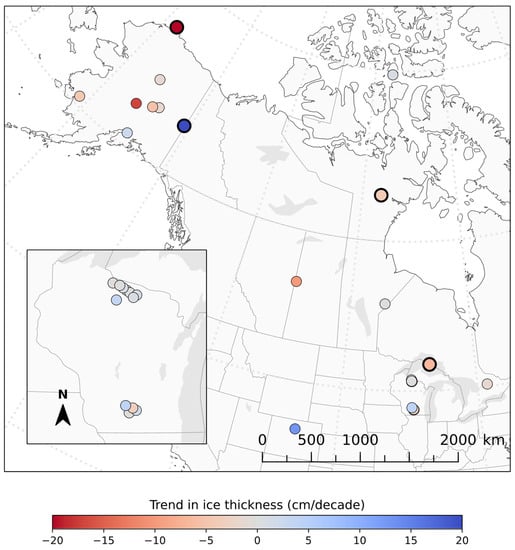 Although ice is forming later and melting earlier in most lakes and rivers across North America [6,7,10], the trends for ice thickness are not as clear, which may be explained in part by the complex interplay of climatic factors governing ice growth and thickness [18], in addition to a relatively short time series [49]. Relatively short time series may have contributed to only 15% of our lakes exhibiting significant trends in ice thickness. In a study of 1313 simulated large lakes and reservoirs across the Northern Hemisphere, ice thickness only significantly declined in 10% of the study systems [11]. Although there is not yet a consistent trend in ice thickness over time, there is considerable variation in ice thickness amongst years with an over 65 cm difference in ice thickness, on average, amongst years. In Baker Lake, Nunavut, ice thickness varied between 92 and 290 cm and in Green Lake, Colorado since 1984, thickness varied from 0 cm and no ice to 150 cm thick ice. Similarly, in MacDonald Lake in central Ontario, the decay of lake ice thickness was higher in 2014 and 2015 (−0.77 rate of decay per year), compared to 2012 (−0.44 rate of decay per year) [20]. However, across a longer time series, ice thickness studies conducted in lakes and rivers across Russia since 1955 found a significant decline in ice thickness over time [14].