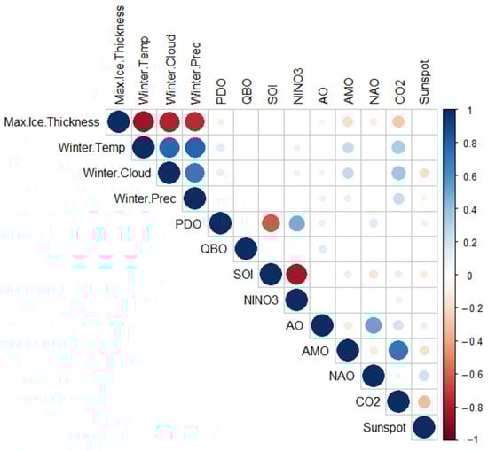 Maximum ice thickness was strongly and negatively correlated with mean winter air temperatures (r = −0.84, p < 0.05), mean winter cloud cover (r = −0.77, p < 0.05), and mean winter precipitation (r = −0.74, p < 0.05) (Figure 2). Maximum ice thickness was also negatively and significantly correlated with PDO (r = −0.09, p < 0.05), AO (r = −0.07, p < 0.05), AMO (r = −0.20, p < 0.05), NAO (r = −0.11, p < 0.05), and global carbon dioxide concentrations (r = −0.27, p < 0.05). Warmer winter temperatures, which are shown to strongly predict ice cover [10,34], were positively correlated with winter cloud cover (r = 0.78, p < 0.05), winter precipitation (r = 0.79, p < 0.05), PDO (r = 0.13, p < 0.05), NINO (r = 0.08, p < 0.05), AMO (r = 0.25, p < 0.05), and global carbon dioxide concentrations (r = 0.34, p < 0.05). High cloud cover, which could imply lower levels of solar radiation, was positively correlated with PDO (r = 0.11, p < 0.05), NINO (r = 0.08, p < 0.05), AO (r = 0.08, p < 0.05), AMO (r = 0.25, p < 0.05), and global carbon dioxide concentrations (r = 0.38, p < 0.05). Increasing cloud cover was negatively associated with sunspots (r = −0.19, p < 0.05). Increased winter precipitation was positively associated with AO (r = 0.08, p < 0.05), AMO (r = 0.1, p < 0.05), global carbon dioxide (r = 0.24, p < 0.05), and negatively associated with sunspots (r = −0.07, p < 0.05).