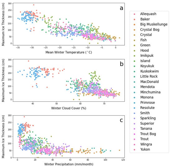 Maximum ice thickness (cm) against (a) mean winter air temperatures (°C), (b) winter cloud cover (%), and (c) winter precipitation (mm/month) for 27 waterbodies in North America. The different colors represent the lakes and rivers considered in the study.
