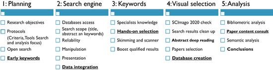 This research has as its reference the systematic review and meta-analysis protocols proposed by Shamseer et al. [31] (Preferred reporting items for systematic review and meta-analysis protocols—PRISMA-P), notably in 12 items (17 considering sub-items) listed in the introductory and method sections. As presented by Lima et al. [32] and Yu et al. [33], the progressive selection of articles follows five stages: planning, collection (including search engine and keywords selections), treatment, and data analysis and presentation. The Figure 1 summarizes and underlines key activities per stage.