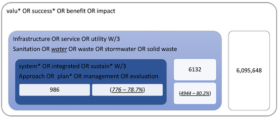 This stage shows the research complexity as the use of simple keywords results in a high number of answers in several areas of interest. There is a diversity of terms used in this context, making it necessary to alternate the search between the most recurrent ones and using compound words with up to 3 intermediate fragments. Figure 2 presents this refinement progress with each inclusion of compound words in the titles, abstracts, and keywords of articles published between 2011 and 2021, and summarize the results found by the code TITLE-ABS-KEY ((valu * OR success * OR benefit OR impact) AND ((infrastructure OR service OR utility) W/3 (water)) AND ((system * OR integrated OR sustain *) W/3 (approach OR plan * OR management OR evaluation)) AND PUBYEAR > 2010 AND PUBYEAR < 2022 AND (LIMIT-TO (DOCTYPE, “ar”)) AND (LIMIT-TO (SUBJAREA, “SOCI”) OR LIMIT-TO (SUBJAREA, “BUSI”) OR LIMIT-TO (SUBJAREA, “ECON”))).