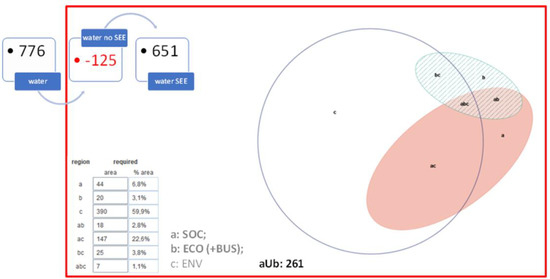 The word “water” is prioritized due to its predominance among the others (sanitation, waste, stormwater, and solid waste), as well as the social and economic themes (including business, sample “water SE”–aUb) over the environmental one because of the diversity of intertwined disciplines. The representation of these three groups (SOC, ECO, and ENV) in Figure 3 further shows that the environmental issues still influence the sample water SE—illustrated by the overlapping circle “c” over areas “a” and “b”.