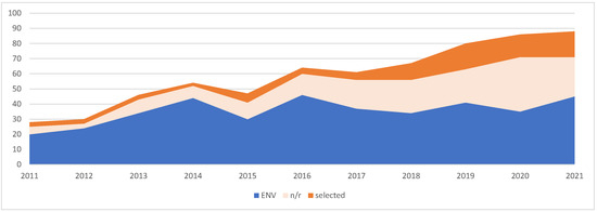 The water SE sample was broken down into not related (n/r) and selected articles to compare it with the environmental theme (ENV). As Figure 4 illustrates, during the analysis period there was an overall increase in publications, but the ENV theme has remained constant since 2014. This behavior showed a real growth of social and economic water interest (water SE sample), captured by the study sample since 2018 when 70% of the selected papers were published.