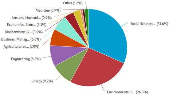 The stratification of the themes remaining in the study sample indicates the water multi-disciplinarity, presented in Figure 5. The predominance of the social theme (31.6%) was noticeable and the mentioned environmental influence (26.3%) was confirmed. The theme ECO (+BUS) (9.7%), in its turn, highlighted a slight advantage over energy (9.2%) and engineering (8.8%).