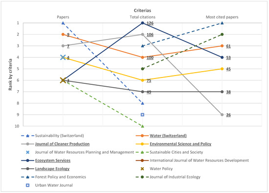 The 84 selected articles were published in 47 journals, resulting in less than 2 articles per journal (1.8). Despite this diversity of sources, the study sample was categorized according to the articles number, total citations, and most cited articles to identify the popular journals. As underlined in Figure 6, 5 are regularly listed in the top 10 (Water Switzerland, Journal of Cleaner Production, Environmental Science and Policy, Ecosystem Services and Landscape Ecology). They have a common interest in environmental science thought themes, such as production, policies, and management. Water is the specific focus of one of them, covered by 13 research areas, as well as the economic and social values of ecosystem services.