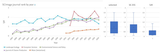 The ranking progress of these five journals is shown to the left of Figure 7, illustrating the similar performance of most of them over time with increasing SJR rankings since 1999—even those more recently published (Ecosystem Services and Water Switzerland). The journal Landscape Ecology diverges from this behavior given the drop in ranking since 2010. It resumed its ranking as at its beginning (1999 and 2000). Still, these five journals are positioned in the first quartile of the rank Scimago 2020 (SJR > 0.6), suggesting well-qualified content of the sample.