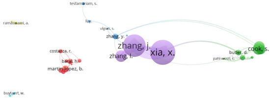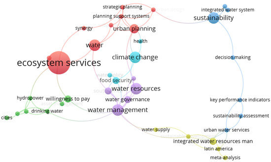 In the study, 28 of the 357 keywords meet these requirements and comprise six clusters with between four and nine items. The word “ecosystem service” has the highest number of occurrences (10), followed by water resources, water management, climate change, and sustainability with five each. The word “water management” presents the highest frequencies of joint citation with “water governance” and “South Africa.” This analysis kept all words to preserve the formation of clusters and networks.