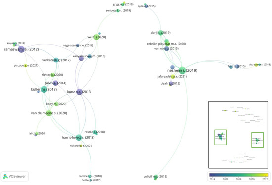 Network of selected articles according to reference coupling. Data from Scopus, visualizing adapted from VOSviwer 1.6.18 [37,38,39,40,41,42,43,44,45,46,47,48,49,50,51,52,53,54,55,56,57,58,59,60,61,62,63,64,65,66,67,68,69,70,71,72,73,74,75,76,77,78,79,80,81,82,83,84,85,86,87,88,89,90,91,92,93,94,95,96,97,98,99,100,101,102].