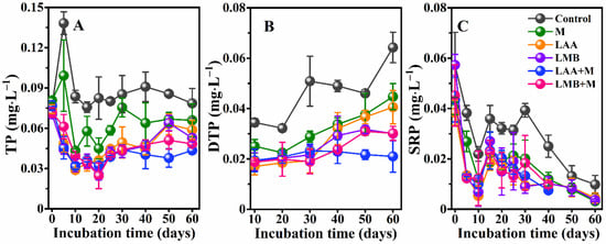 LMM and macrophytes, whether used in combination or individually, significantly reduced water column P concentrations (Figure 1 and Figure 2), with the LAA+M group exhibiting the best performance. Aquatic ecosystems in all incubators generally reached steady states by the 15 days of incubation. In addition, SRP concentrations increased after reaching equilibrium stability in all LMM treatments. TP and DTP concentrations were reduced after 60 days of restoration in the M, LAA, LMB, LAA+M, and LMB+M groups by 16% and 30%, 25% and 37%, 33% and 53%, 45%, and 67%, and 38% and 53%, compared with the control group, respectively. In addition, SRP concentrations in the overlying water were below the limit of detection (<0.01 mg·L−1). A comparison of the P removal rates from the water column among treatments indicated that the LMM group was most efficient in controlling water column P concentrations and that its efficiency was further improved when used in conjunction with macrophytes.