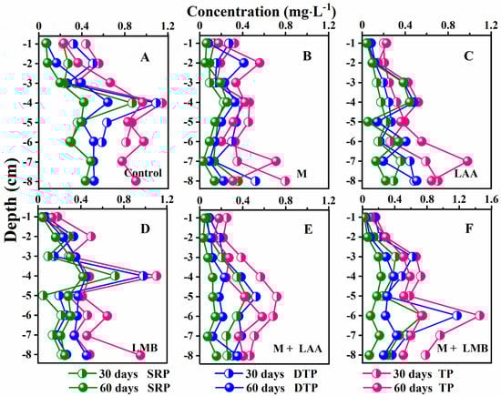 The changes of TP, DTP, and SRP concentrations in the porewater of the six treatments during the experiment. All data are triplicates. (A–F) indicate the concentration changes of TP, DTP, and SRP in sediment pore water of the Control, M, LAA, LMB, LAA+M, and LMB+M experimental groups on the 30-day and 60-day, respectively.