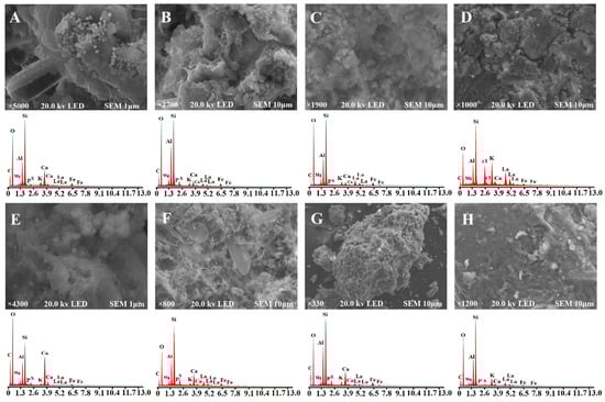 SEM images and spectra of chemical composition of Control (A), LAA (B), LAA+M (C), Original LAA (D), M (E), LMB (F), LMB+M (G) and Original LMB (H). Original LAA and Original LMB are substances that are not mixed with sediments respectively.