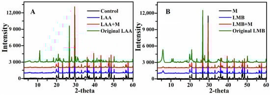 (A) statistical XRD patterns of control, LAA, LAA+M, and Original LAA. (B) statistical XRD patterns of M, LMB, LMB+M, and Original LMB. Original LAA and Original LMB are substances that are not mixed with sediments respectively.