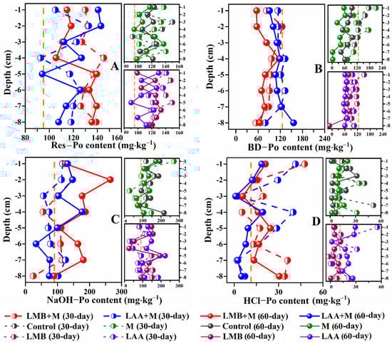 Vertical distribution of different P forms in sediments of the six treatment groups during the experiment. (A–D) represent the changes of Res−Po, BD−Po, NaOH−Po and HCl−Po contents in sediment, respectively. Each graph consists of three distinct subgraphs. The left subgraphs represent LAA+M and LMB+M groups, respectively. The upper right subgraphs represent control and M groups, respectively. The lower right subgraphs represent LAA and LMB groups, respectively. All data are triplicates. The vertical dashed line is the start P contents of the sediments.
