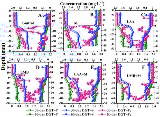 Vertical change of the DGT-labile P (Fe/S) concentrations in sediments of the six treatments groups during the experiment. The location of the sediment–water interface is represented by zero. (A–F) indicate the changes of DGT-labile P (Fe/S) concentrations in sediment of the Control, M, LAA, LMB, LAA+M, and LMB+M groups on the 30-day and 60-day, respectively.
