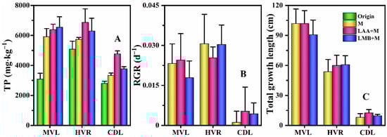 The TP contents of macrophyte seedlings in the M, LAA+M, and LMB+M groups increased by 41%, 71%, and 57% during the incubation period, respectively (Figure 7A). The mean net height growth of seedlings was 98 cm, 58 cm, and 10 cm in the MVL, HVR, and CDL treatments, respectively (Figure 7B), with mean RGR values of 0.02 d−1, 0.03 d−1, and 0.004 d−1, respectively (Figure 7C).