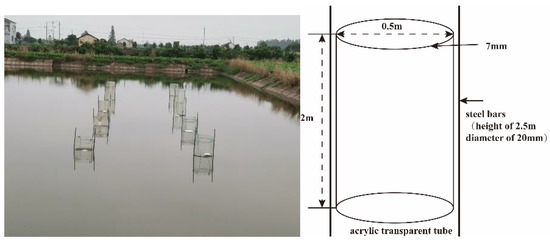 The experiment was carried out at Chonghu Fishery, Gong’an County, Jingzhou City, Hubei Province, China (29°57′ N, 112°14′ E). The pond had an aquaculture history of more than 20 years with the sediment accumulation thickness of more than 40 cm. During this period, the main breeding object is grass carp. The breeding density is 1500–2000 kg/acre. Grass carp should be fed 3–5% feed daily of its body weight (25–32% nitrogen). Pond sediment thickness increases by 2–3 cm per year. Eight acrylic transparent tubes with a diameter of 0.5 m, a height of 2 m, and a thickness of 7 mm were vertically inserted into a 1.4 m deep pond with a sediment insertion depth of 0.4 m. The 8 acrylic transparent tubes formed 8 independent small enclosure spaces (Figure 1). Two steel bars (height of 2.5 m, diameter of 20 mm) were vertically inserted into the pond sediment with insertion depth of 0.5 m along each transparent cylinder, with the cylinder diameter (0.5 m) as distance between two steel bars. The two steel bars were, respectively, fixed onto acrylic transparent tubes with iron wire (Figure 1). The nitrifying and denitrifying bacteria used in the experiment were purchased from Nanjing Celt Biotechnology Co., Ltd., Jiangsu, China. The mixed bacteria were composed of nitrifying bacteria and denitrifying bacteria, of which the proportion of nitrifying bacteria was 50%, and the number of viable bacteria was more than 1010 cfu/g, and the proportion of denitrifying bacteria was 50%, and the number of viable bacteria was more than 1010 cfu/g. Nitrifying bacteria were composed of ammonia-oxidizing bacteria and nitrite-oxidizing bacteria, while denitrifying bacteria were composed of nitrite-reducing bacteria and nitrite-reducing bacteria. The 8 acrylic transparent tubes were divided into four groups, with nitrification and denitrification bacteria mixture concentrations of 0, 0.15, 0.30, and 0.60 mg/L (viable bacteria content > 1010 cfu/g). Before the addition of nitrifying and denitrifying bacteria, the samples were collected from each concentration group. After the addition of nitrifying and denitrifying bacteria, samples were collected on the 1st, 3rd, 7th, 10th, and 15th day. The samples included water samples, sediment samples, and sediment microbial samples. Three samples were extracted from each group of sediments for microbial amplification and sequencing. Total organic carbon and total nitrogen in sediment samples, and ammonia nitrogen, nitrite, nitrate, total nitrogen in water samples were repeated three times for data analysis.