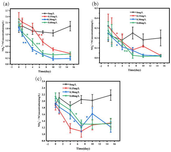 Concentrations of ammonia nitrogen (a), nitrite nitrogen (b), and nitrate nitrogen (c) in water after adding different concentrations of nitrifying and denitrifying bacteria. The black “*” indicate significant differences between 0 mg/L groups, the red “*” indicate significant differences between 0.15 mg/L groups, the blue “*” indicate significant differences between 0.30 mg/L groups, and the green “*” indicate significant differences between 0 mg/L groups. (the “*” expression p < 0.05, the “**” expression p < 0.01).