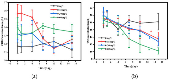 Concentrations of COD (a) and TN (b) in the water added with different concentrations of nitrifying and denitrifying bacteria. The black “*” indicate significant differences between 0 mg/L groups, the red “*” indicate significant differences between 0.15 mg/L groups, the blue “*” indicate significant differences between 0.30 mg/L groups, and the green “*” indicate significant differences between 0 mg/L groups. (the “*” expression p < 0.05).