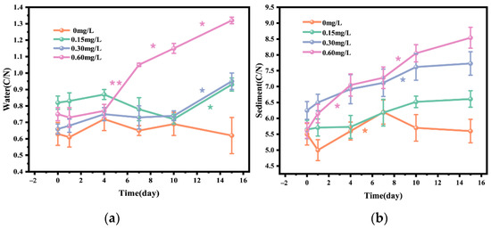 C/N ratio in water (a) and C/N ratio in sediment (b) after addition of different concentrations of nitrifying and denitrifying bacteria. The orange “*” indicate significant differences between 0 mg/L groups, the green “*” indicate significant differences between 0.15 mg/L groups, the purple “*” indicate significant differences between 0.30 mg/L groups, and the pink “*” indicate significant differences between 0 mg/L groups. (the “*” expression p < 0.05, the “**” expression p < 0.01).