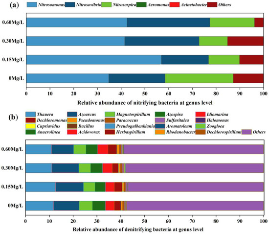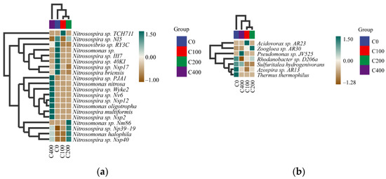 At genus level, species composition of nitrifying bacteria (a) (amoA gene) and denitrifying bacteria (b) (NirS gene) in different concentrations.