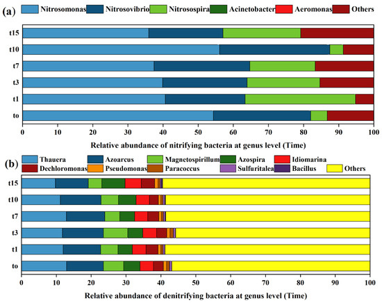 In this study, the observed species index and Chao1 index were used to analyze the diversity of nitrifying and denitrifying bacteria. The results showed that the diversity of nitrifying and denitrifying bacteria showed an obvious initial upward and then downward trend over the 15-day treatment (p < 0.05). The species diversity of nitrifying bacteria was increased (days 0–3), remained stable (days 7–10), and decreased (days 10–15) (Figure 8a). The species diversity of nitrifying bacteria on day 15 was similar to that on day 0. Consistently, the species diversity of denitrifying bacteria was increased (days 0–7), remained stable (days 7–10), and decreased (days 10–15) (Figure 8b). However, the species diversity of denitrifying bacteria on day 15 was higher than that at day 0. The analyses of Simpson index and Pielou_e index showed that the species evenness and relative abundance of nitrifying and denitrifying bacteria were not significantly changed over 15 days, indicating their species stability.