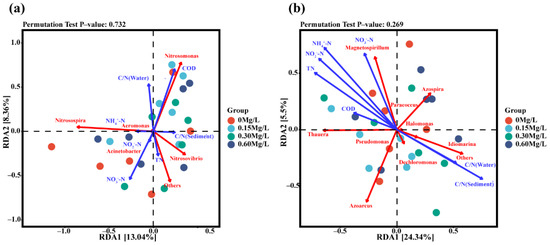 Redundancy analysis of nitrifying bacteria (a), denitrifying bacteria (b), and environmental factors at genus level.