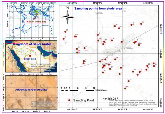 Many sampling campaigns have been conducted to collect GW samples from accessible and active wells covering the study area. Forty-seven GW samples were collected from the study area after enough pumping to ensure that representative aquifer water was attained, and thus reflected the chemistry of the GW with the least possible uncertainty [1]. Acid-cleaned polypropylene bottles were carefully rinsed several times with the well water before sampling, then filled, preserved, and cooled as per rules for different analyses. The respective precautions and rules were considered, along with the commensurate care, preservation, immediate pretreatments, and in-field measurements. The areal distribution of the sampling points is shown in Figure 3. One-liter polypropylene bottles were collected for the hydrochemical analyses (major cations and anions), cooled without adding a specific preservative agent, split, and pretreated following the rules of different individual analyses according to the standard methods and sampling directions [34,35,36]. Samples of 1 L for ammonium and nitrate ions analysis were acidified with ≈2 mL concentrated trace element analysis-grade sulfuric acid. Samples were chilled in an icebox until they were taken to the laboratory within 6–8 h of sample collection. All analyses were carried out in the Water and Environment Research Unit (WERU), college of Science and Humanities, at Ad-Dawadmi, Shaqra University.