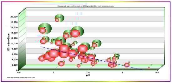 pH coupled to temperature dominantly controls dissolution, precipitation, mass transfer, and all other related GW system processes. Measurement of GW pH provides essential information about the geochemical equilibrium [44,45]. The relationship between pH and EC, coupled with calcium, magnesium, bicarbonate, and sulfate ion concentrations as the bubble radii, are shown in Figure 5. The pH values varied from 6.8 to 8.35 with an average of 7.332 ± 0.345 SD, n = 47, showing that pH values dominantly lie in the neutral to slightly alkaline range. This theme emphasizes the inverse relationship between EC and pH, with a congruent decrease in calcium and sulfate ion concentrations. This behavior highlights the precipitation and removal of calcium at higher pH values. The individual differences between Ca2+ and SO42− may be ascribed to differences in solution activities concerning each constituent. Another principal contributor to such an effect is the HCO3− concentration, which exhibits the same trend with Ca2+ as SO42−; Figure 6. Mg2+ concentrations were consistently lower than Ca2+ ion loads, except for one sample showing a Mg2+ load that was extremely higher than that of Ca2+. Mg2+ showed a smoother trend with pH and had no definite trend with HCO3− and SO42−, as was the case with Ca2+.