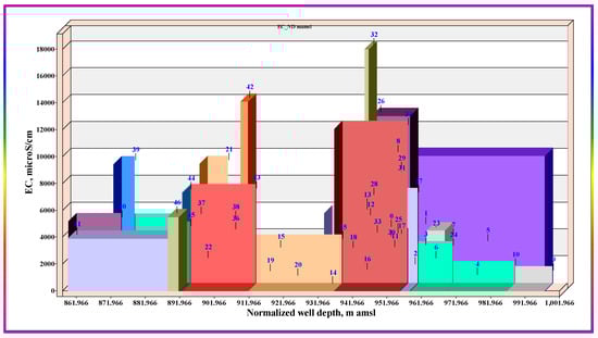 Coupling higher well depths with lower altitudes may support reaching a deeper water layer that may be of originally higher salinity. To validate this hypothesis, the depths of the wells were normalized to the mean sea level and correlated against EC levels; Figure 9. Inspecting Figure 9 indicates no relation between EC levels and normalized well depths, with extremes lying everywhere, such as IDs 39, 42, and 32, in different localities and at different normalized depths. This theme may nullify the hypothesis of deep layer water mixing and corroborates the dominance of the point source’s effects.