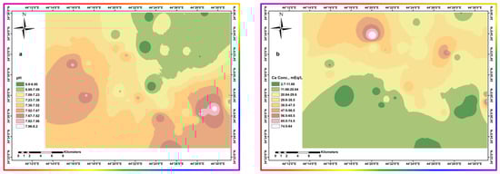 The increase in sulfate ion concentrations (Figure 12c) may suggest precipitation of calcium, mainly in the form of calcium carbonate. Figure 12b,d show that Ca2+ and HCO3− have an inverse distribution to each other. Continuous HCO3− replenishment by absorbing atmospheric carbon dioxide into irrigation water during watering causes calcium precipitation, leading to a final concentrating profile of the other constituents. This hypothesis requires equimolar amounts of chloride to sodium to exclude ion exchange. This equimolar provision is suitable for all parts except the northeastern part, where there are lower chloride concentrations. This anomaly suggests the occurrence of ion exchange due to the availability of calcium rains at lower pH values, of about 6.8, as shown in Figure 12a. Large loads of other soluble ions interfere with calcium salt precipitation by lowering its ion activity [47,49,50].