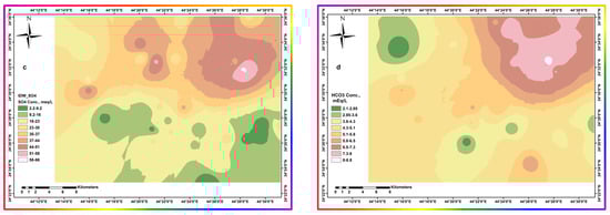 Spatial distribution of different parameters throughout the area. (a) pH (b) Calcium Conc. (c) Sulfate Conc. (d) Bicarbonate Conc.