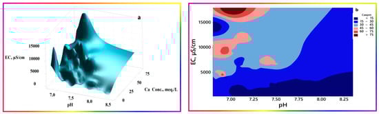 Figure 14. Three-dimensional surface (a) and contour plots (b) portray the interchanges among pH, EC, and Ca2+. Ca2+ ion concentration expressed in milliEquivalents per liter (mEq/L), and EC in µS/cm. - NO3− has no geogenic or even known atmospheric sources in the region under study. NO3− exhibits a direct linear relationship with all other constituents at low levels, except HCO3−, which has inherent fluctuation pathways. Moreover, NO3− exhibits no trend for exchange or precipitation processes. Normality testing failed, with a p-value < 0.005, indicating the occurrence of unbalanced and localized accumulation processes. The probable processes include evaporation concentration, soil flush-out additions with subsequent nitrification, and seepages. The other additive process, nitrification, implies no direct, definite relationship with the other constituents, which may enable its basis for making judgements or comments. Evaporation concentration remains the most probable process to affect nitrate concentration in a localized fashion that impairs its normal distribution.