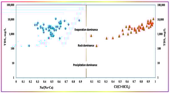 The hydrochemical properties of the water should be understood to identify the origin and the hydrochemical evolution of the GW. The Gibbs plot [26] has been commonly used to determine the hydrochemical processes that control GW chemistry. It was developed originally for surface water, and subsequently applied to GW. Some limitations for its application in GW studies were discussed extensively by [61]. The GW hydrogeochemistry is generally maintained through natural and anthropogenic sources that affect, or are controlled by, the physiochemical parameters. The Gibbs plot aids the understanding of the main factors’ dominant role in maintaining hydrochemical water characteristics [8,26]. The Gibbs diagram is often employed to reflect the controlling effects of GW hydrochemical types (rock weathering, evaporation concentration, and precipitation). The water samples greatly affected by atmospheric precipitation are located in the lower corners; those controlled by rock weathering are located in the middle areas; whereas those controlled by evaporation crystallization are located in the upper corners. In order to compare the findings of this demonstration to the classically obtained results, the Gibbs diagram was drawn and discussed as a widely employed representative method for delineating the principal controlling processes [4,8,62,63,64]. The Gibbs diagram (Figure 18) emphasizes the evaporation dominance over the total salinity, with only one sample lying in the rock dominance region, i.e., sample No. 14. Although the Gibbs diagram results in the same conclusions as those mentioned above (evaporation dominance), it does not provide detailed insights into the nature and type of the influences, or into several easily identified, traced, and evidenced interconnected processes.
