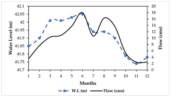 The monthly average river flows and water levels of the Fèngshān River at Xinpu bridge (121°3′56.268″ E, 24°49′32.959″ N) over the years (1970–2020) are shown in Figure 2. According to the WRA database, the average annual water level is 41.93 m, and the average annual flow is 9.62 cm. The average monthly flow and water level graph indicates that peak flows occur in the summer season while low flows in the winter season. The trend of high flow can also be used to deduce that the main rainy season lasts from June to September.