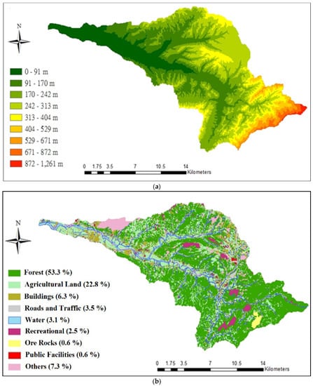 The surface topography of the study area is mountainous, with a slope range from 5% to 35% and elevation ranges of 91 to 1261 m, as shown in Figure 3a. Landuse data from field investigations conducted by NLSC comprised nine coverage groups. It was investigated that 76% of the overall area is covered with agricultural and forest land, as shown in Figure 3b.
