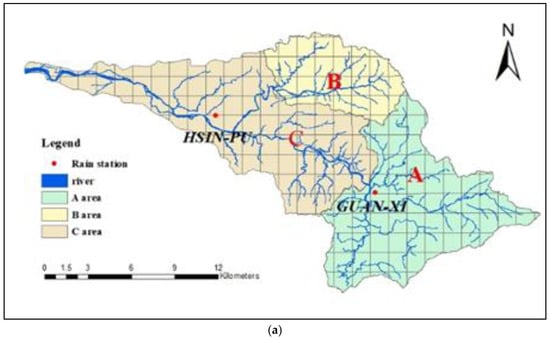In this study, the developed model of the previous study [] was adopted for flood level forecasting. Hussain et al. (2021) worked on real-time correction of 1 h ahead flood forecasting using QPF data for the same study area. In the present study, we also developed a 1 h ahead flood-forecasting model with modification of QPF rainfall calculation and its application in the real-time correction process of flood forecasting. For this purpose, the previously developed model was adopted. Hussain et al. [] used HEC-HMS and WASH123D watershed models for 1 h ahead flood level forecasting in Fèngshān River Basin. They presented a comprehensive step-by-step methodology for achieving 1 h ahead flood forecasting levels in Fèngshān River Basin. The conceptualization of the study area for model application as a preliminary explanation and configuration is shown in Figure 4, where the model’s geometry is divided into three zones. Zone A and B discharge simulations were performed using the HEC-HMS model, and then WASH123D was applied to simulate flood levels of zone C.