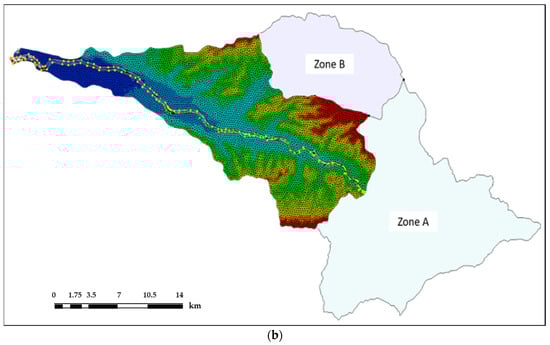 Conceptualization of the study area for model application, zones (A and B) in HEC-HMS and zone C in WASH123D (a) Mesh construction from radar grid points (b) grid constructions of WAH123D [].