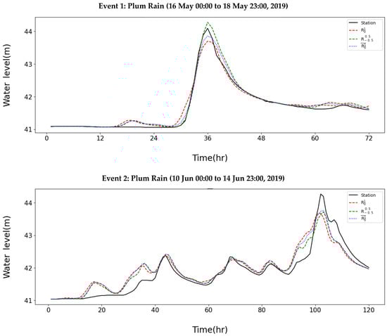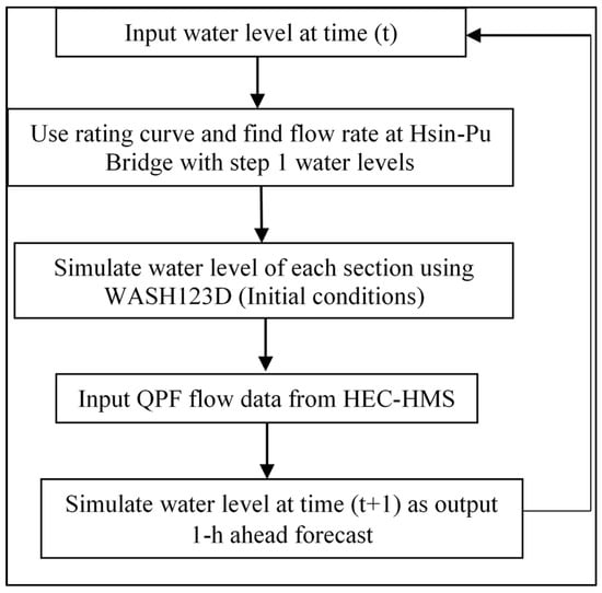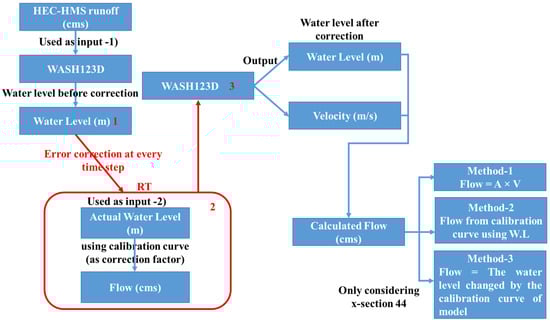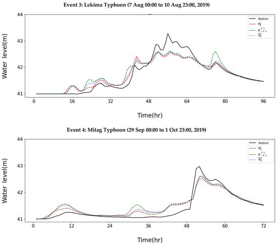 After calculating the QPF data, the values are used as input in HEC-HMS to obtain runoff. Then we run WASH123D to simulate and forecast flood levels during selected rainfall and typhoon events. We adopted the physical real-time correction process (RT), as shown in Figure 9, to correct the flood levels. The performance of the model was accessed using four measures such as coefficient of determination (CC), the root means square error (RMSE), the peak water level error (PE), and the peak time error (PTE). The details of these measures are provided in Hussain et al. [].