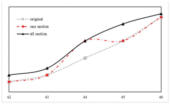 In order to verify the influence of real-time physical correction on flow by WASH123D, the mass balance approach was used to calculate flow. Since there is only one water level measuring station (Hsin-Pu Bridge) in the study area, we adopted the following three methods (Figure 9) to calculate the flow and used them to evaluate the flow change after the model is instantly corrected by real-time physical correction. Out of 82 river sections, only the 44th section has to measure data on the water level, so the 44th section was used as a reference.