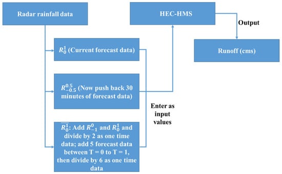 - add up every 10 min of rainfall forecast data between t = 0 and t = 1 i.e., (, , , , ), and divided by 6 to obtain the QPF input value () at time step t = 0.