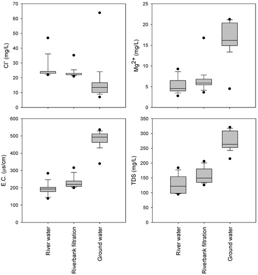 Concentration of Cl− and Mg2+, electrical conductivity (E.C.), and total dissolved solids (TDS) of the river water, riverbank filtrate, and groundwater (OMW 8G) (n = 20–32).