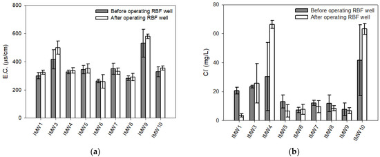 Concentration of chloride ions (Cl−) (a) and electrical conductivity (E.C.). (b) in inland monitoring wells (IMWs) before and after the operation of a horizontal collector well.