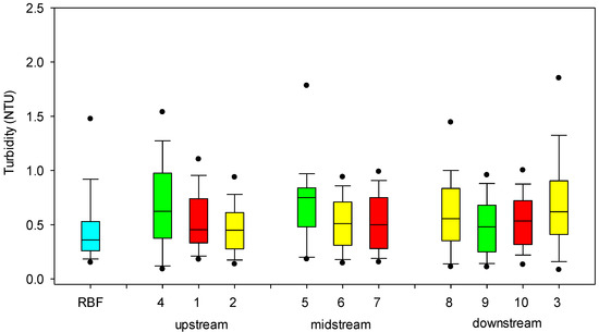 We collected samples with a 1 L bailer from 10 laterals below the water table in monitoring wells to observe how the water quality differed according to the location of each lateral in the horizontal collector well. The temperature changes were not significant, and the turbidity results are shown in Figure 4, which includes the production well and 10 laterals. The turbidity of the river water was high at approximately 11 NTU. The riverbank filtrate had an average turbidity of only 0.5 NTU, which was significantly lower than that of river water, and was within the range of 1 NTU or less for each lateral.