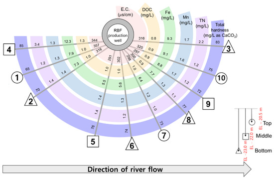 Figure 5 presents the concentrations of iron, manganese, and total nitrogen, total hardness, electrical conductivity, and DOC for each lateral. The iron and manganese concentrations in the individual laterals varied based on their location. The iron concentration was high in lateral #4, and the manganese concentrations were high in laterals #9, #10, and #3. In the riverbank filtrate, an increase in the concentration of iron and manganese was observed, which could be due to reducing conditions; however, the concentrations increased in the lateral direction, where the concentration was measured only in a specific location; this observation could be due to the geological characteristics of the area and not the river water. Lateral #4, which had high levels of iron, exhibited DOC and nitrogen levels different from those in the river water and other laterals. In addition to the effects of upstream and middle streams, the effect of fertilizers accumulated on the land could affect the riverbank filtrate from lateral #4 because that specific location was used as an agricultural land.