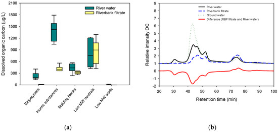 Changes in dissolved organic matter fractions determined by LC−OCD (biopolymers, humic substances, building blocks, low molecular weight (MW) neutrals, and low MW acids) (a) (n = 9), and (b) LC−OCD chromatograms of the river water, riverbank filtrate, and groundwater (OMW 8G) (n = 7).