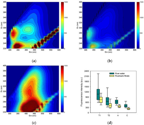 Fluorescence excitation–emission matrix (F-EEM) spectroscopy contour plots of river water (a), riverbank filtrate (b), groundwater (OMW 8G) (c), and changes in the fluorescence intensities in selected regions (T1, T2. A, C peaks) in the river water and riverbank filtrate (d) (n = 12).