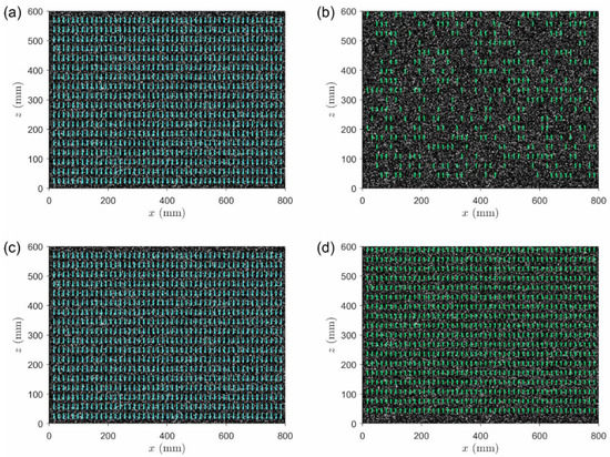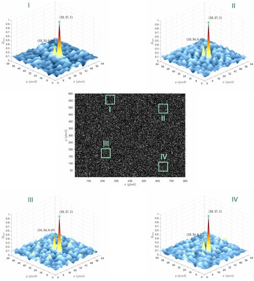 Two synthetic particle image sets were first generated by the method built in the popular open-sourced PIV analysis software—PIVlab 2.38 [14]. One image set has uniform particle displacement moving downward with a constant displacement of five pixels. Similar particle image pattern but moving up was applied to the other set, with the displacement being set to four pixels. The tracking particle density in both image sets was set to 40%. The synthetic crossflow condition was then generated by the superposition of both synthetic particle image sets. Note that 101 consecutive frames were generated with additional seeding of random background noise. A snapshot of an image generated by the above-described approach as well as four example Rcorr maps of four randomly selected areas can be found in Figure 1.