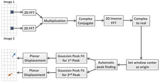 The concept of the new algorithm is implementing a new step right after the cross-correlation step; the full procedure is illustrated Figure 2. The entire procedure is similar to a PIV analysis routine that first adopts two consecutive images and divides each image into several square interrogation windows. Cross-correlation is then applied to the grayscale matrices of each image pair in each window for identifying the tracer displacement of maximum likelihood. The computation of discrete cross-correlation is very time consuming. To improve the computational efficiency, fast Fourier transform (FFT) is generally employed to the image matrices before performing cross correlation. By transferring to the frequency domain, a cross-correlation calculation can be simply done by the multiplication of coefficients, largely cutting down computation time. After setting zero frequency to the center of each window, the inverse FFT is employed to transfer the result back to the time domain, yielding a cross-correlation coefficient map. Then the identification of multiple prominent correlation peaks will follow up.