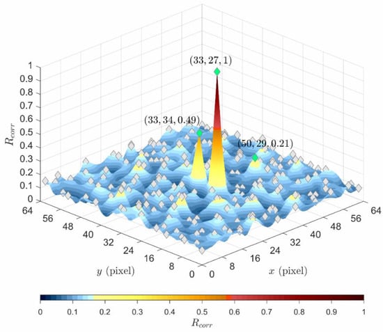 Normalized cross-correlation coefficient (Rcorr) maps of four randomly selected windows with a size of 64 × 64 pixels. Note that the central particle image represents a snapshot of a synthetic stratified crossflow composite of one unidirectional flow moving downward by constant 5 pixels and the other moving upward by constant 2 pixels.